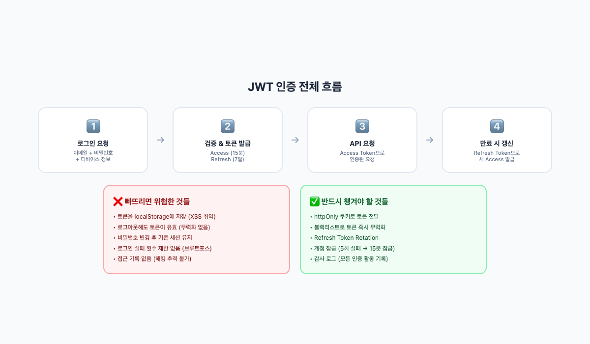 JWT의 가장 큰 문제: 발급된 토큰을 서버가 직접 무효화하기 어렵다.것이 이 글에서 다루는 모든 보안 조치의 출발점입니다.
